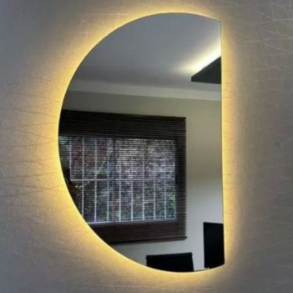 Espelhos de Cristal Meia Lua com Led Atrás, Marca Brasileira *Cebrace ou Guardian*, de 3 a 5 milímetros de espessura. A espessura, depende das dimensões da peça, que são lapidados e Jateados. LED Comum entre 60/120/240 luzes, por M2.