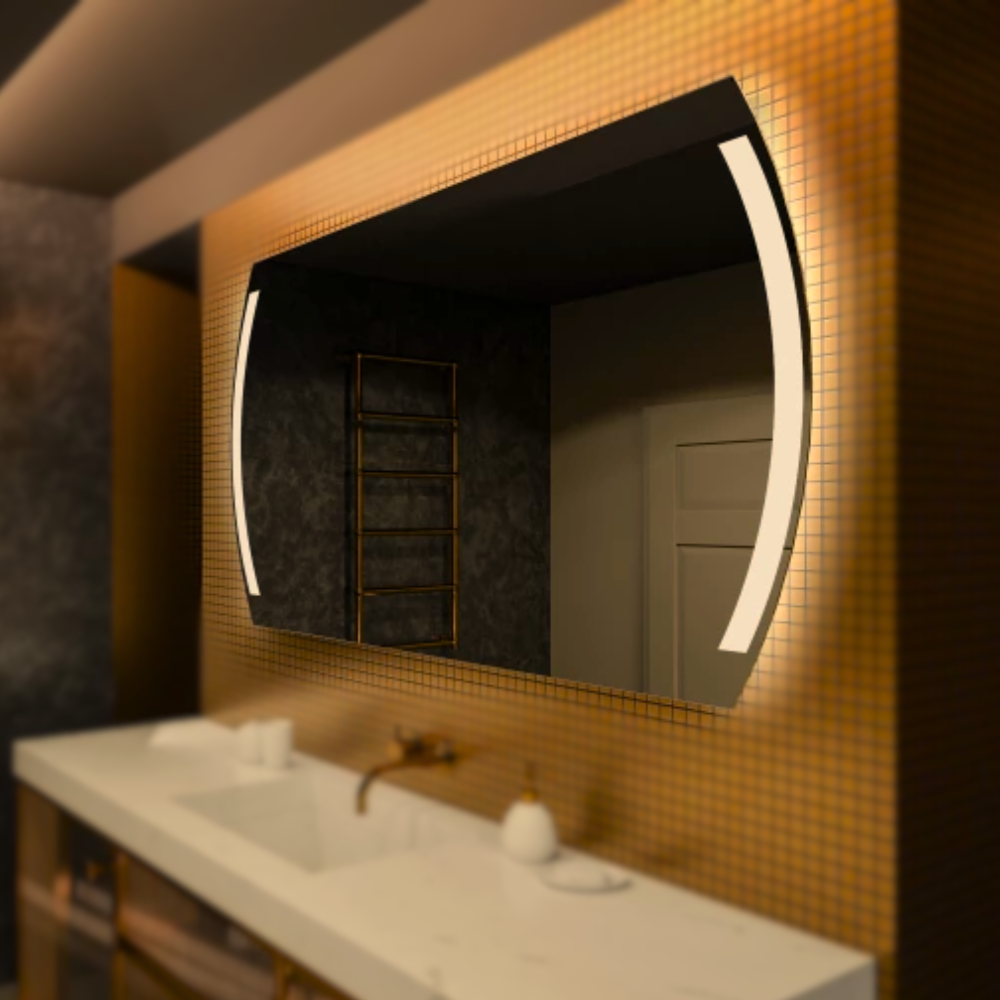 Esse é um modelo Romântico, traz consigo uma elegância e romantismo, com apenas um toque, deixará o ambiente mais amplo e sofisticado, com a iluminação ainda mais agradável, é usado na Horizontal. As bordas são levemente arredondadas, o modelo vai com iluminação frontal, na faixa do jateado, o led fica dentro da caixaria. Dando várias opções de designer, você pode optar por cm de bodas e de faixas do jateado, sendo bordas iguais, ou diferente do jateado, pode escolher a combinação que mais lhe atende, podendo ser mais largo ou mais estreito, o Touch Screen, acima ou entre a faixa do Jateado. Ampliando seu ambiente, deixando ainda mais agradável.
